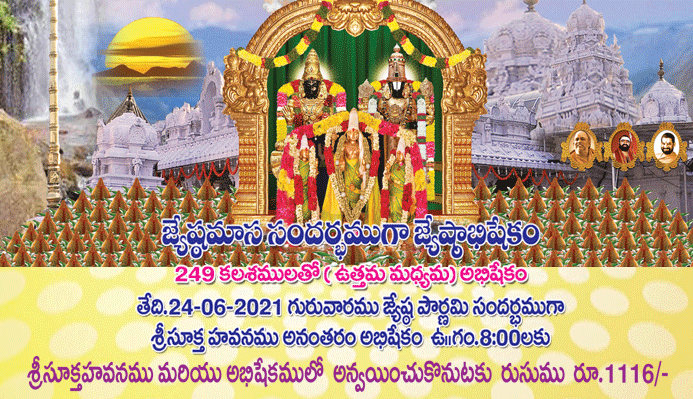 On the Occission of Jyeshta masa - Jyeshtabhishekam 249 Kalsa (Uttama Madhyama) Abhishekam 24.06.2021 Thursday Jyesta pournami, sri suktam havanama anantharam Abhishekam at 8.AM