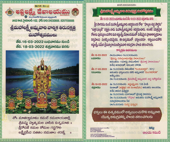 16-03-2022 to 18-03-2022 Sri Mahalakshmi Ammavari Varshika Tirunakshatra Mahotsavamulu. Participate and get blessed.